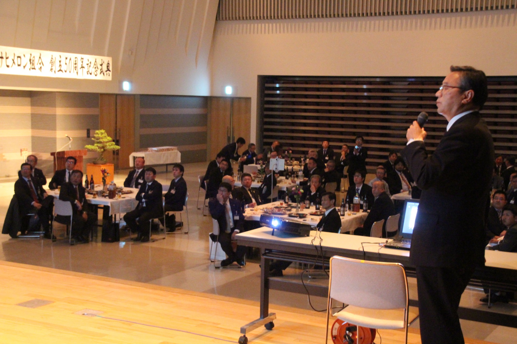 ホクレン農産事業本部 柳山浩之 特任技師を記念講演に招き講演しました。柳山特任技師は前職普及センターに勤め、アサヒメロン組合の発展に大きく関わり、当時を振り返りながら講演を行いました。その中で「畑での生育段階で商品の品質を揃えることができないと、広域の産地で成功することはできない」と述べました。こうした技術スタッフや販売スタッフ、そして商品を生産する組合員の努力がこうして50周年という長きに亘り歩みを進めることができたのでしょう。