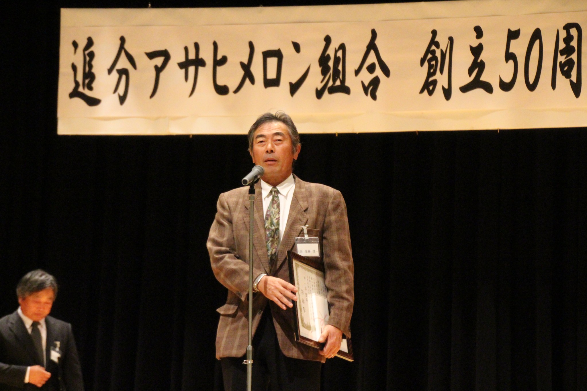 式典では安井貴志追分アサヒメロン組合長が「このように50年を迎えることが出来たのは、多くの先輩たちの創意と努力、そして各関係機関から長きに亘りご支援をいただいた賜物です。また今後グローバル化がより進み市場環境の激変が考えられますが、消費者に信頼される・高品質な産地として尽力します」と組合員を代表して挨拶しました。