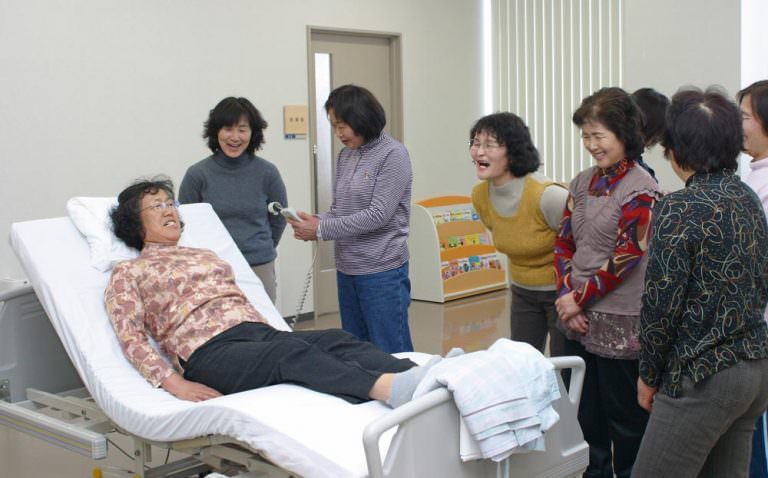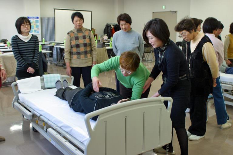 参加者は時には真剣に、時には和やかに、家庭介護の方法を学んだ。